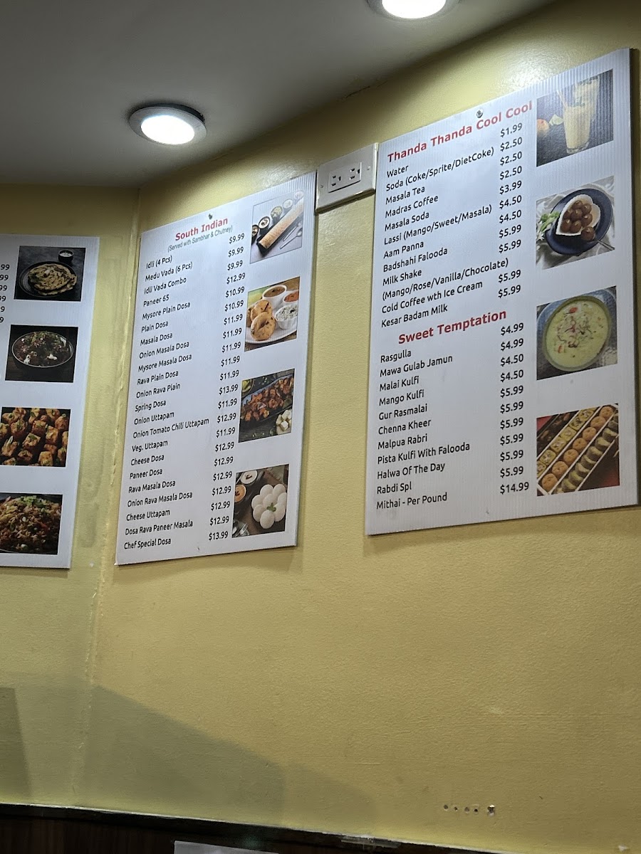 The menu also includes comforting options like Chole Bhature or Sambar, which suit both lunch and dinner occasions, offering a satisfying balance of spice and heartiness. A selection of sweets and desserts such as Rasmalai and Mawa Gulab Jamun provide a gentle finish, complementing the meal or serving as a treat alongside a warm cup of Chai.